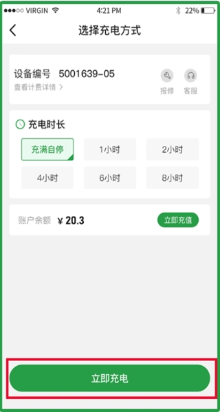 4、进入充电下单页面,选择充电时长后点击立即充电