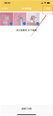 4.打开手机相册界面,把要打包的照片都选上,点击“完成”按钮,具体操作可参考下方图示。
