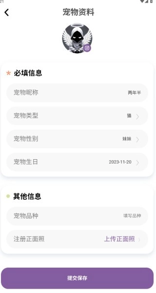 2、接着创建宠物资料,依据要求填写宠物的年龄、性别、品种等相关信息;
