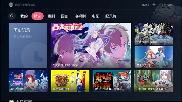 首先,我们来看TV版的界面,目前顶部导航栏仅有七个选项,分别是[我的、精选、番剧、国创、电视剧、电影、纪录片],用户个人关注的UP主发布的视频暂时无法通过TV客户端直接观看。