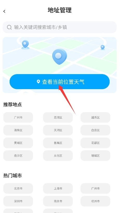 2、可开启手机定位功能自动获取当地天气,也能在管理页面手动输入想要查询的城市名称。