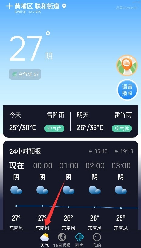 3、在天气首页可以查看实时气象数据,点击语音播报按钮就能收听最新天气情况的语音版本。