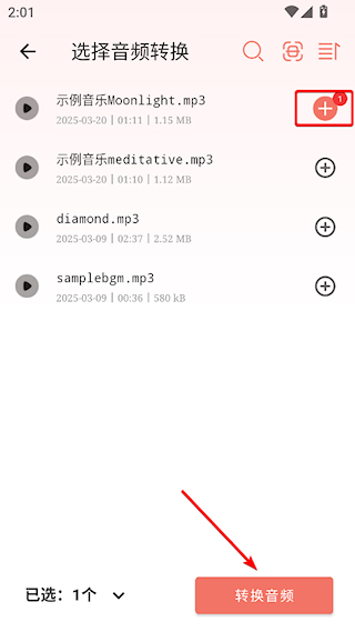 2、挑选要进行格式转换的音频文件,点击界面右下角的【转换音频】按钮。