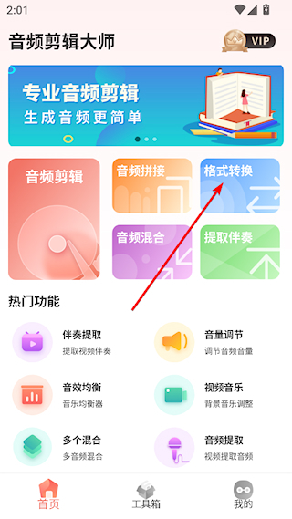 1、启动音频剪辑大师,在首页找到【格式转换】功能,点击该功能后按提示授予软件所需的相关权限,随后进入音频导入界面;
