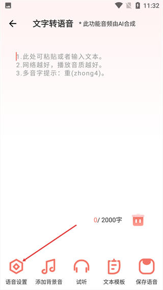 2、进入【文字转语音】页面,点击【语音设置】。