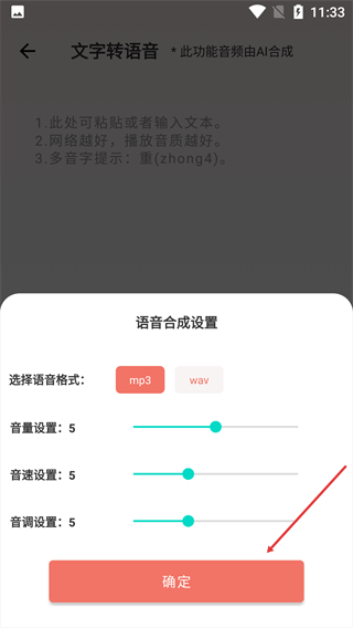 3、在弹出的【语音合成设置】窗口里,选择合适的语音格式,对音量等参数进行调节,所有设置完成后,点击【确定】按钮即可。