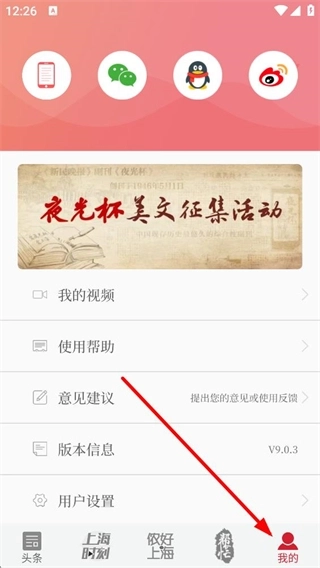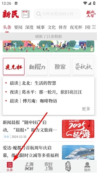 1、进入头条页面后,能看到头条、要闻等多个常规栏目,以及夜光杯、新视力这类特色板块,既可以浏览各类新闻资讯,也能参与美文征集活动。