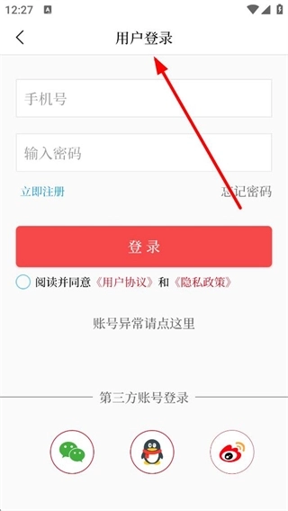 3、用户登录界面支持两种登录方式:一是输入手机号与密码进行登录;二是选择微信、QQ、微博等第三方账号快捷登录。登录前需阅读并同意相关服务协议,若尚未注册账号,可点击“立即注册”完成账号创建。