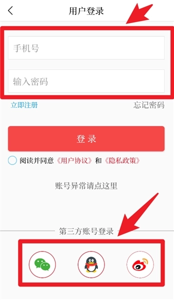 1、在登录界面输入手机号与密码后点击登录键,也能选择微信、QQ或者微博进行一键登录。