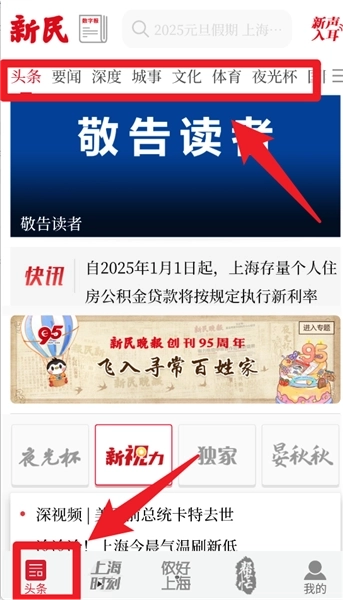 2、点击底部的“头条”栏目,就能浏览要闻、深度、文化、体育等多个资讯分类的内容。