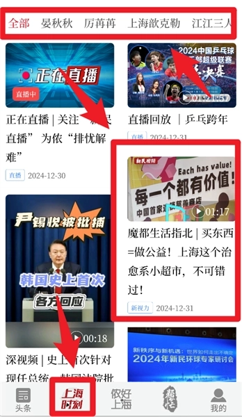 3、进入“上海时刻”栏目,既能观看正在直播的节目与精彩回放,也可浏览热门视频内容。