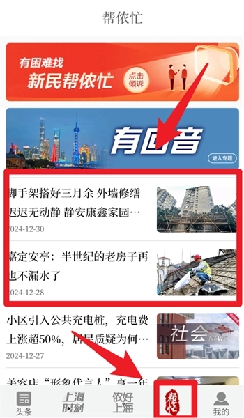 5、选择“帮侬忙”栏目,就能查看居民求助相关新闻以及城市改造的最新进展,从而获取权威的民生资讯。