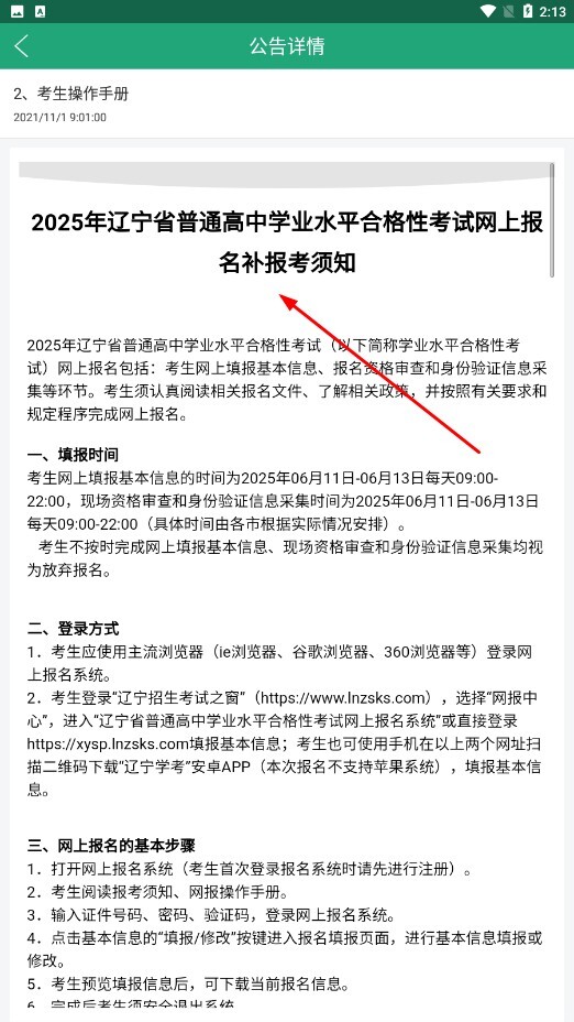 3、公告详情页,可阅读2025年辽宁省普通高中学业水平合格性考试网上报名补报考须知等信息。