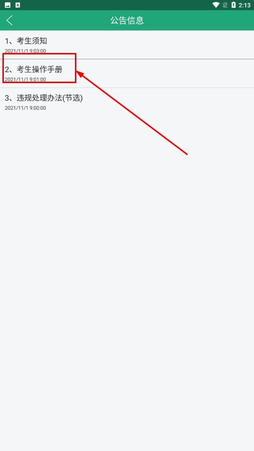 2、在公告信息页面,点击【考生操作手册-公告条目】,查看详细公告内容。