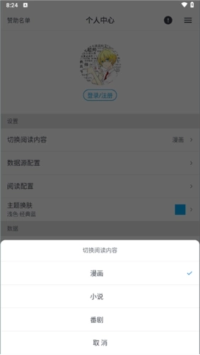 8、除了漫画,这款软件还能为用户提供对应的番剧和小说,用户可以通过“我的”界面里的切换阅读内容功能来进行调整。