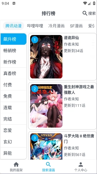 1、在本站完成软件安装并打开后,映入眼帘的是简洁清爽的操作界面,这里汇聚了腾讯动漫、哔哩哔哩、快看漫画、爱优漫、1234漫画、包子漫画等平台的各类漫画资源,同时还提供了排行榜功能与丰富的分类选项。