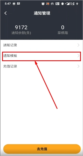 3、在当前页面,用户能够对短信余额进行充值操作,也可以查看充值记录,点击“通知模板”就能进入下一步流程。