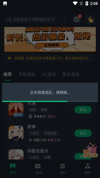 2、在游戏界面找到自己想玩的游戏,如光遇,然后点击游戏右侧的秒完。