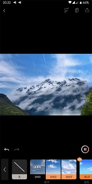 刚拍好的照片已经呈现出「云雾缭绕」的效果,接下来我们要为画面增添「山中细雨,润物无声」的意境。可以在「覆层」里选择「细雨」特效,再调整效果的强弱程度,防止特效过于突出而盖过主体。