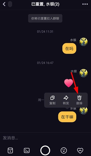 3、要是只想删除某一条聊天信息,大家可以长按该条信息,在弹出的选项列表中点击“删除”按钮即可,操作起来十分方便快捷!