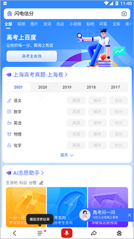 闪电估分官网版是百度的高考专属估分系统,堪称高考志愿填报的终极利器,更是每位考生的秘密法宝。它功能完备,能提供高考估分与查分的一站式服务,还配备了专业的AI志愿助手,为考生量身规划。通过这个系统,考生可以便捷查询往年各高校的录取分数线,全面把握志愿报考的关键信息,为顺利进入理想院校筑牢根基。