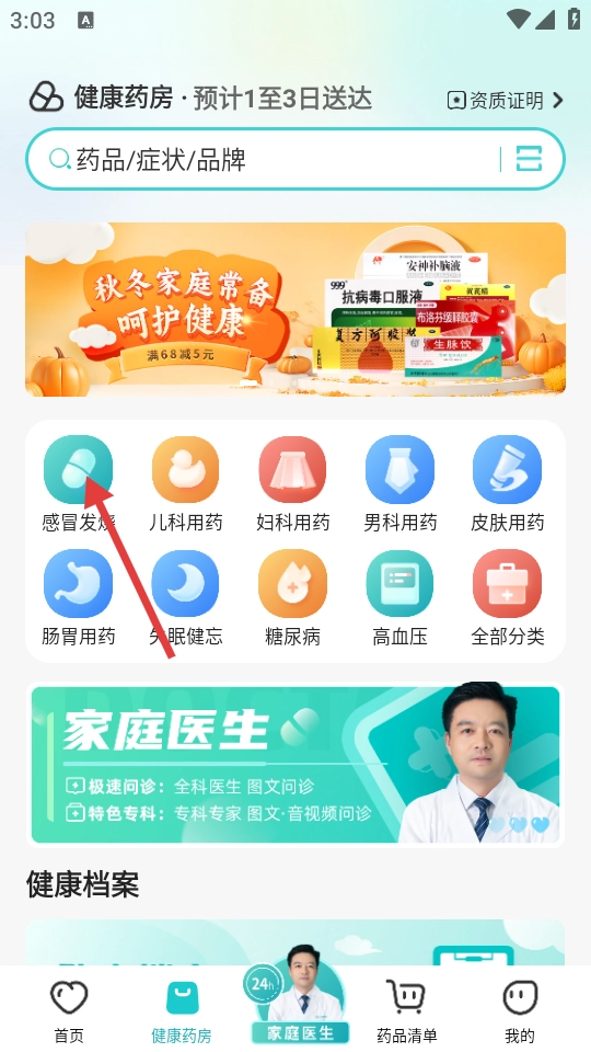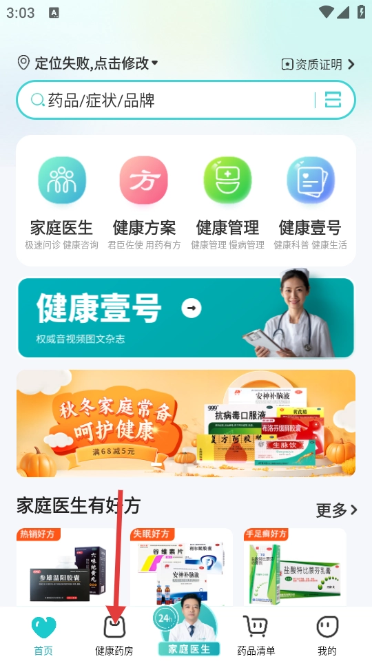 在主界面,点击“健康药房”选项,即可进入健康药房页面。