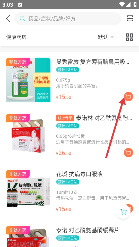 在健康药房页面,点击“感冒发烧”分类,进入感冒药品列表页面。