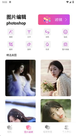 在图片编辑界面里,包含了美颜、文字添加、涂鸦绘制、滤镜调整、贴纸装饰、裁剪、旋转、色调设置以及图片修复这些功能。