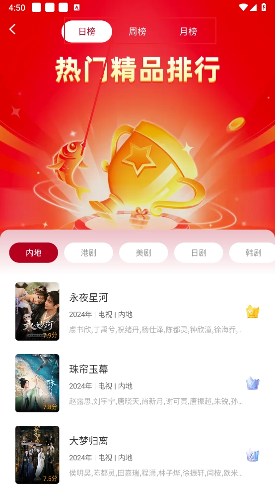点击“排行榜”入口,即可查看日榜、周榜与月榜的相关榜单信息。