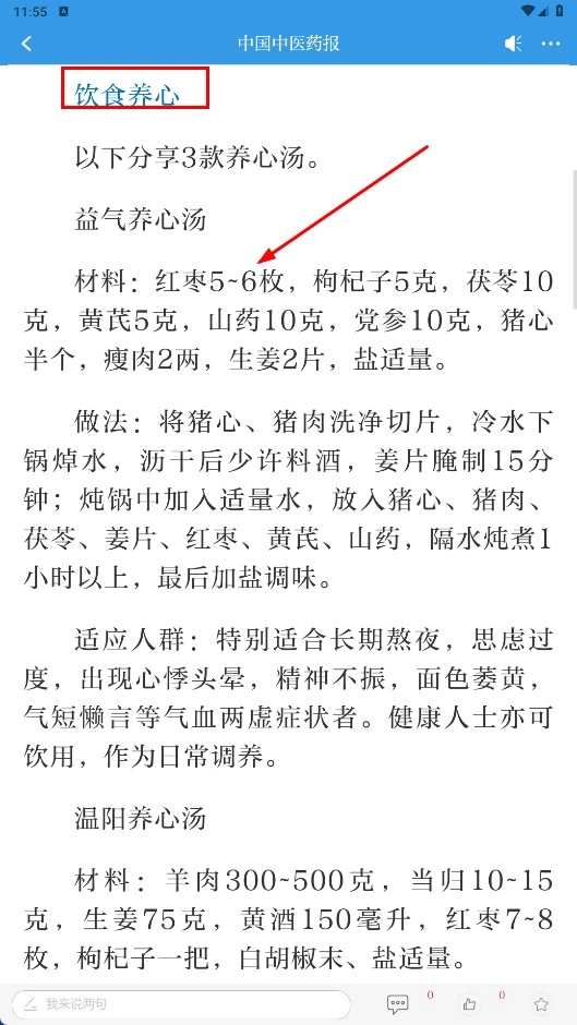 进入文章详情页面后,就能查看【饮食养心-文章主题】板块下的养生汤相关介绍,比如益气养心汤的食材、制作步骤等内容。