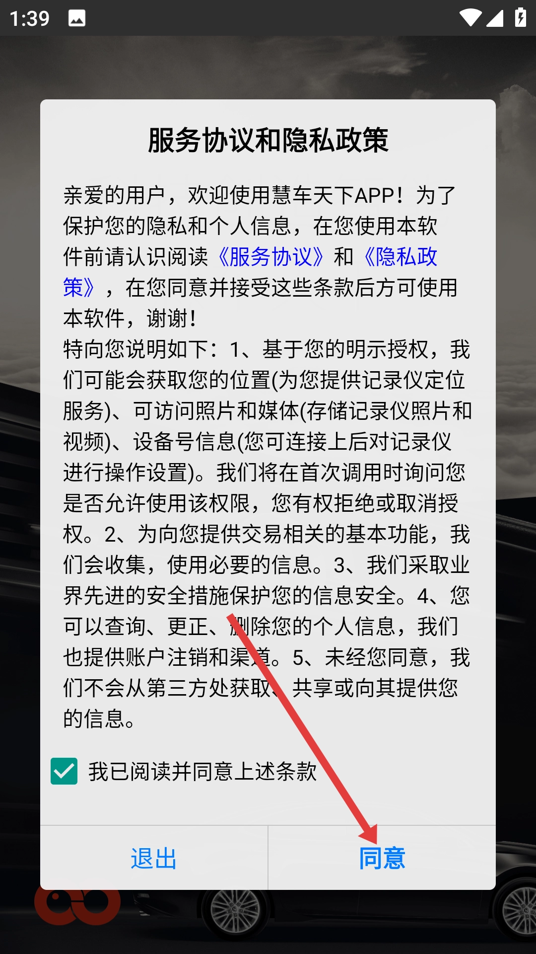 在【慧车天下】的服务协议与隐私政策页面,勾选“我已阅读并同意上述条款”选项,随后点击【同意】按钮,即可继续使用相关服务。