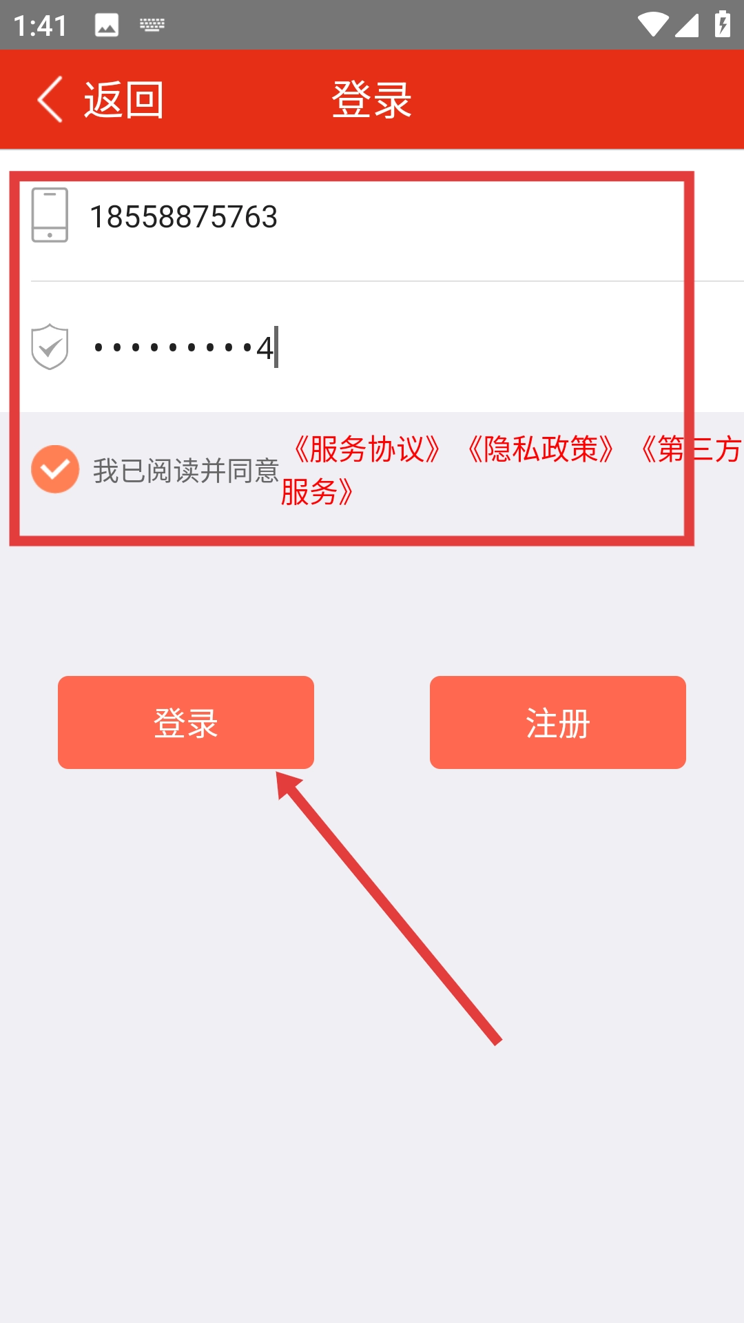 在登录界面输入手机号码与密码,勾选同意相关协议后,点击【登录】按钮即可完成登录流程。
