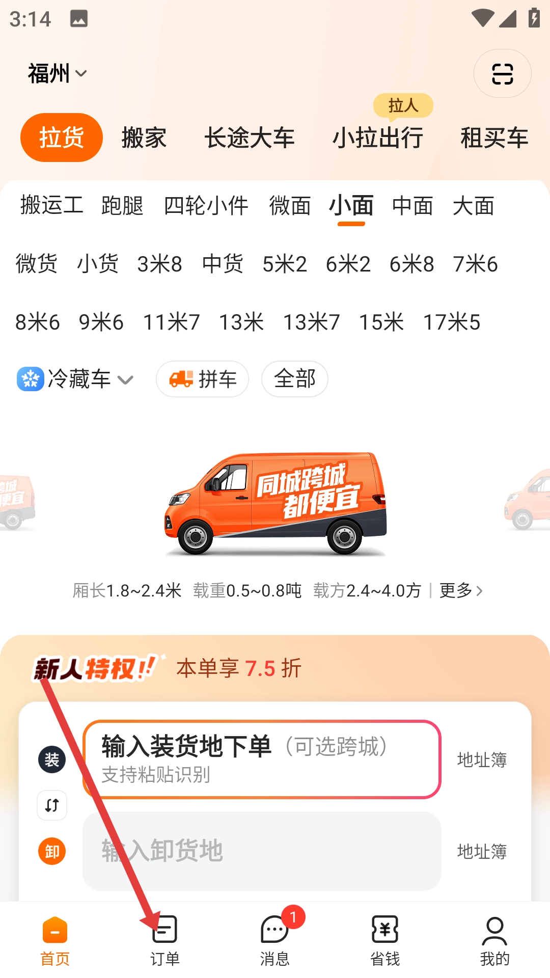 在拉货类首页,选择好各类车型后,点击页面底部的【订单】选项,即可进入订单页面。