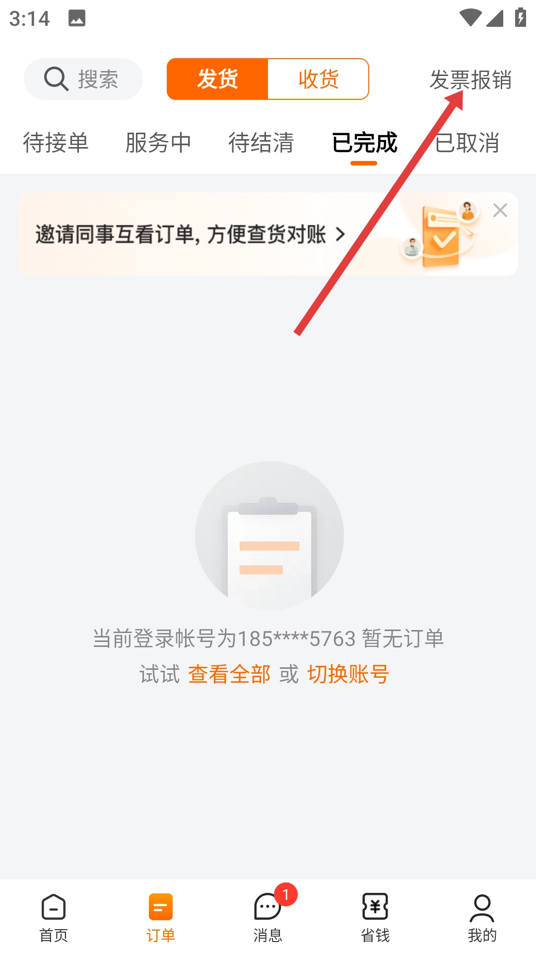 在订单页面,点击右上角的【发票报销】选项,即可进入发票相关操作界面。