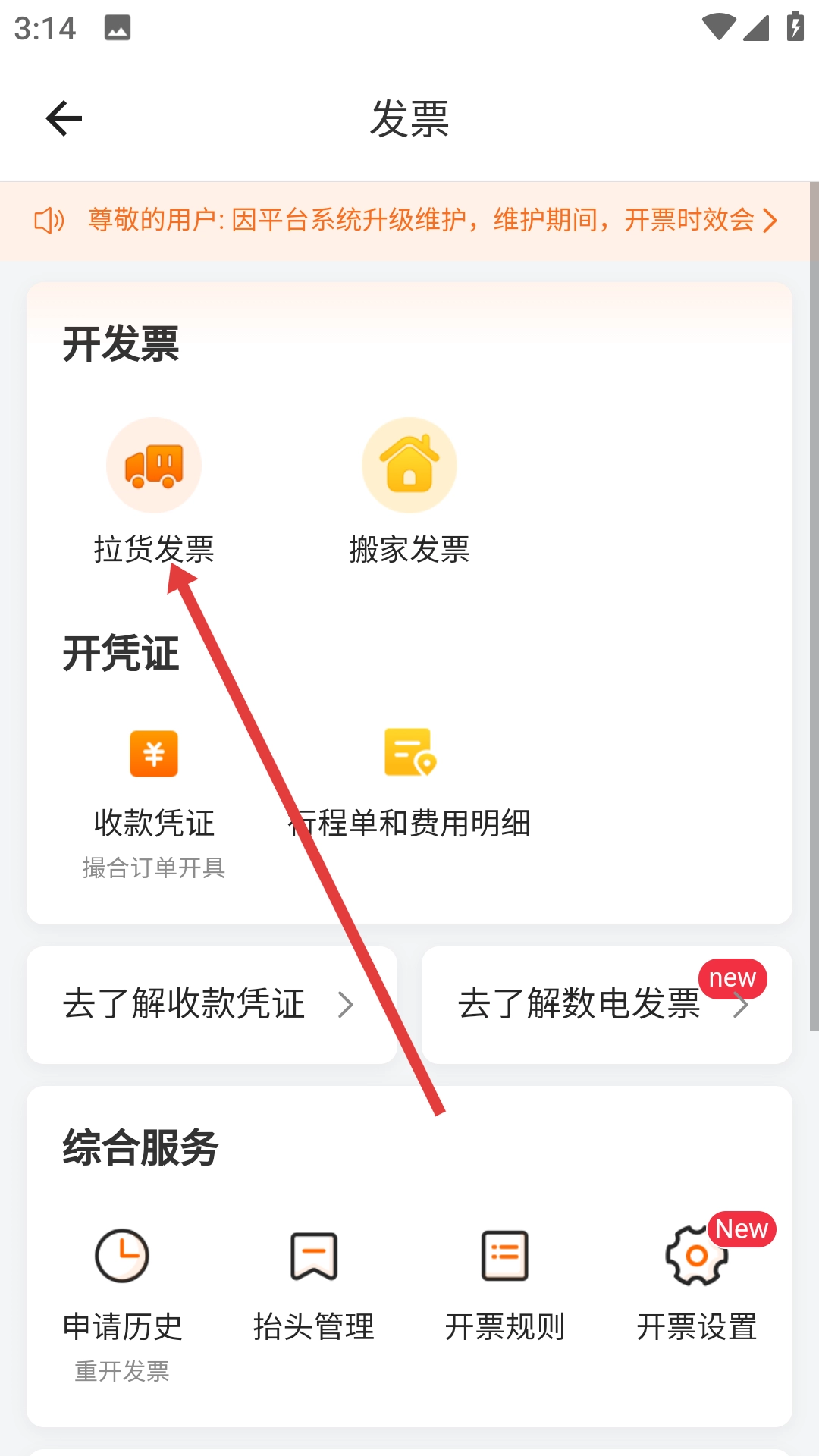在发票界面,点击【拉货发票】选项,即可进入拉货发票的订单列表页面。