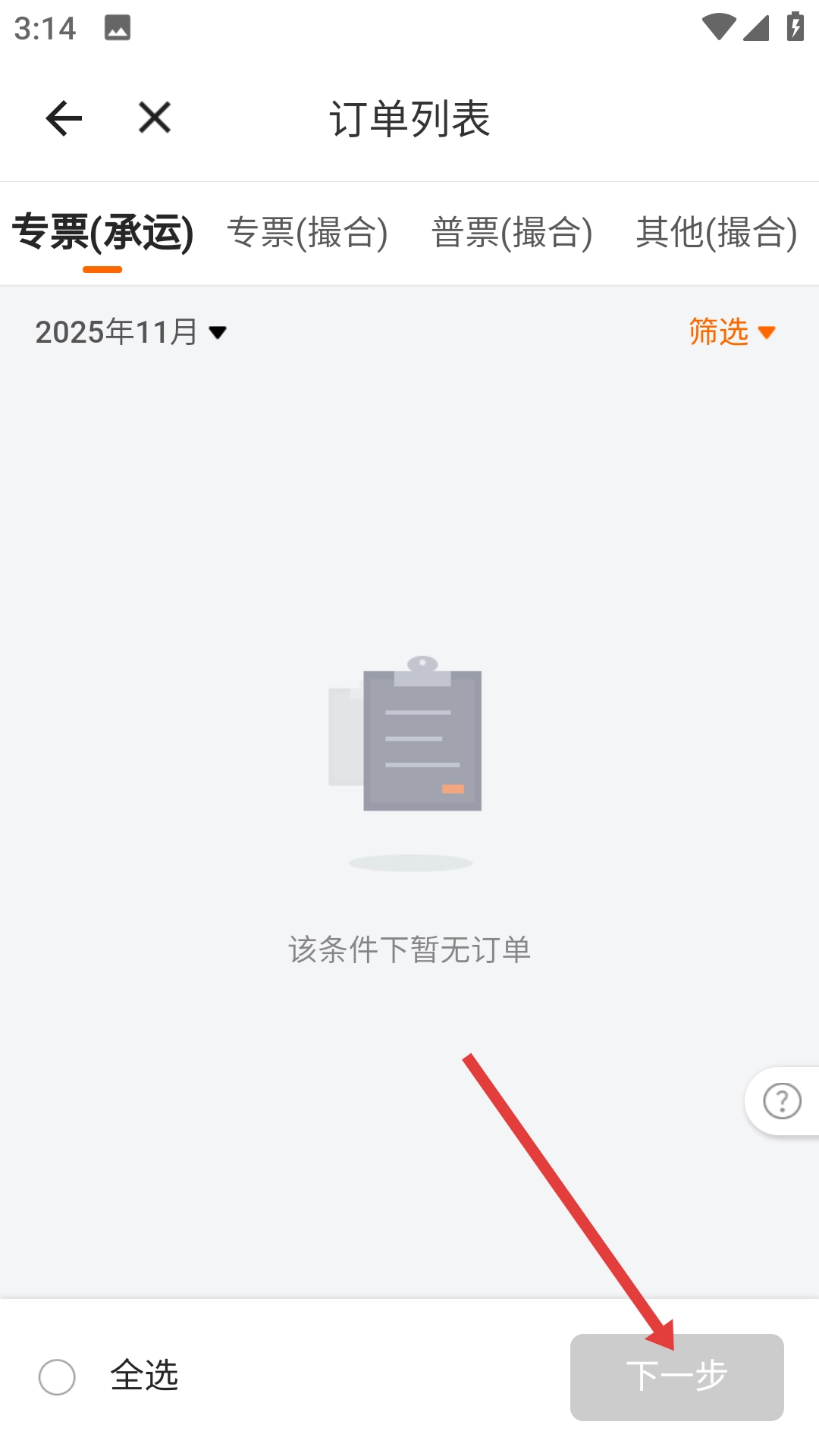 在订单列表页面,选定相应订单后点击【下一步】按钮,就能继续开展发票开具的后续操作。