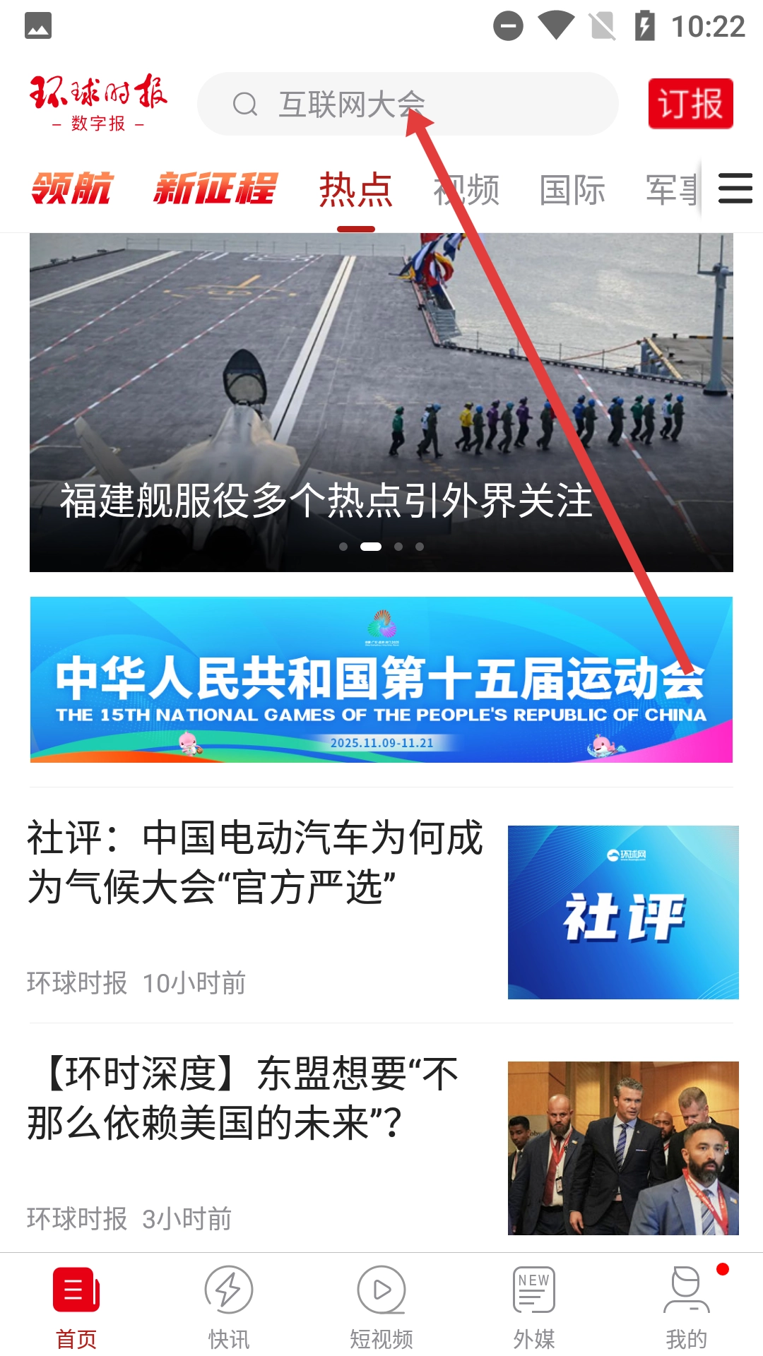 在【环球时报】应用里的搜索栏输入像【福建舰】这样的关键词,就能开展相关内容的搜索。