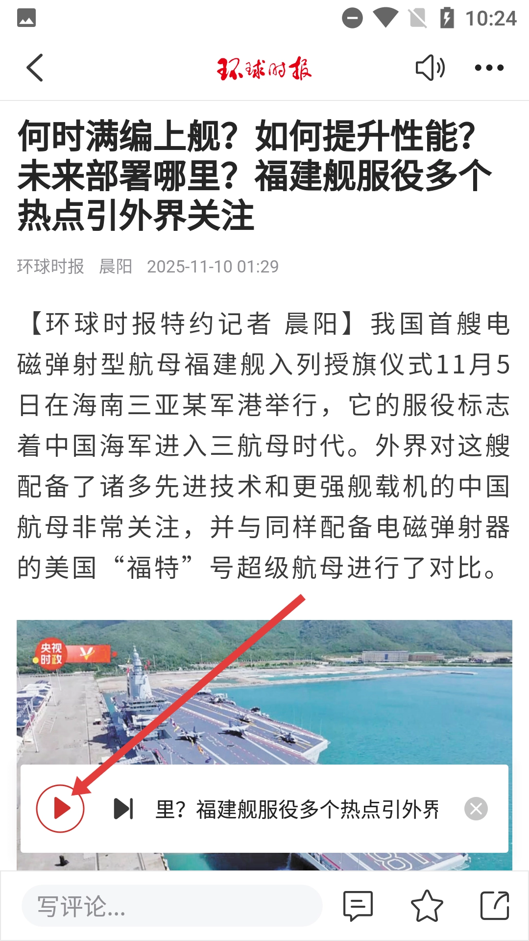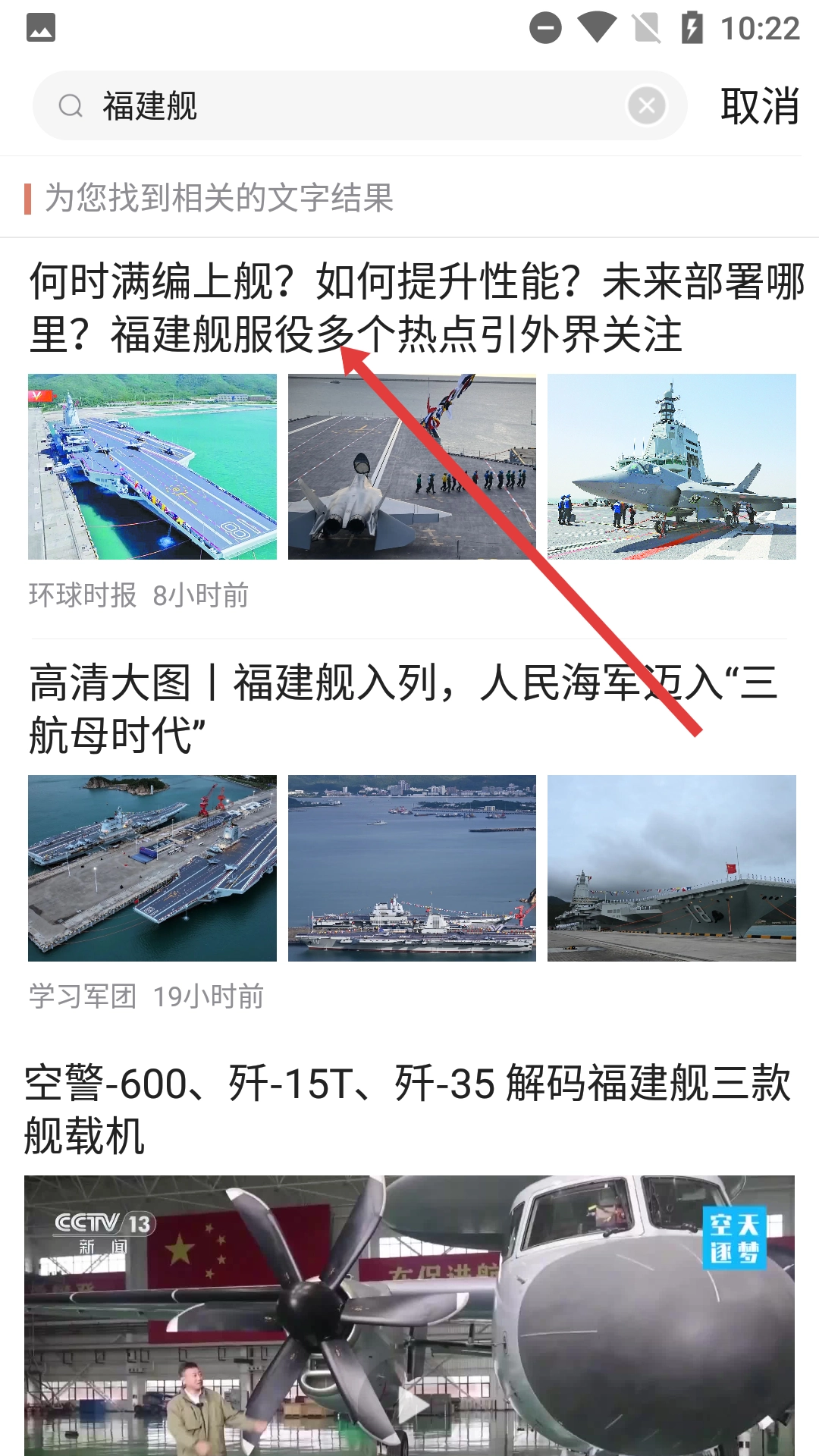 在搜索结果里点击你感兴趣的文章标题,比如有关福建舰的热点文章,就能进入文章的详情页面。