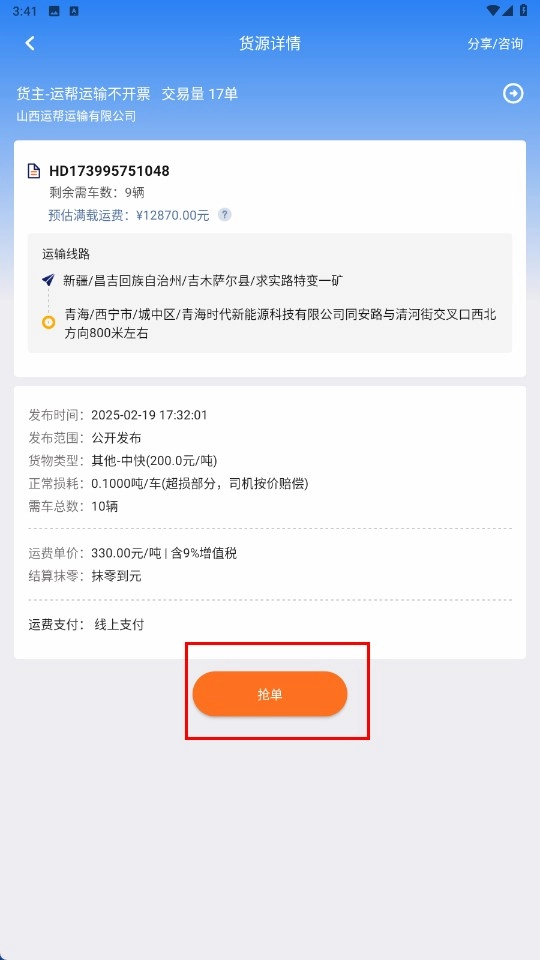 在货源详情页面,你可以查看货主、运输线路、货物类型等相关信息,点击【抢单】功能按钮就能参与抢单。