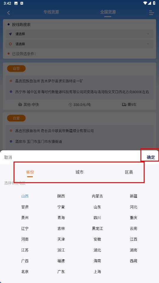 在货源页面,能够选择省份、城市、区县来开展筛选操作,筛选完成后点击【确定-功能按钮】。