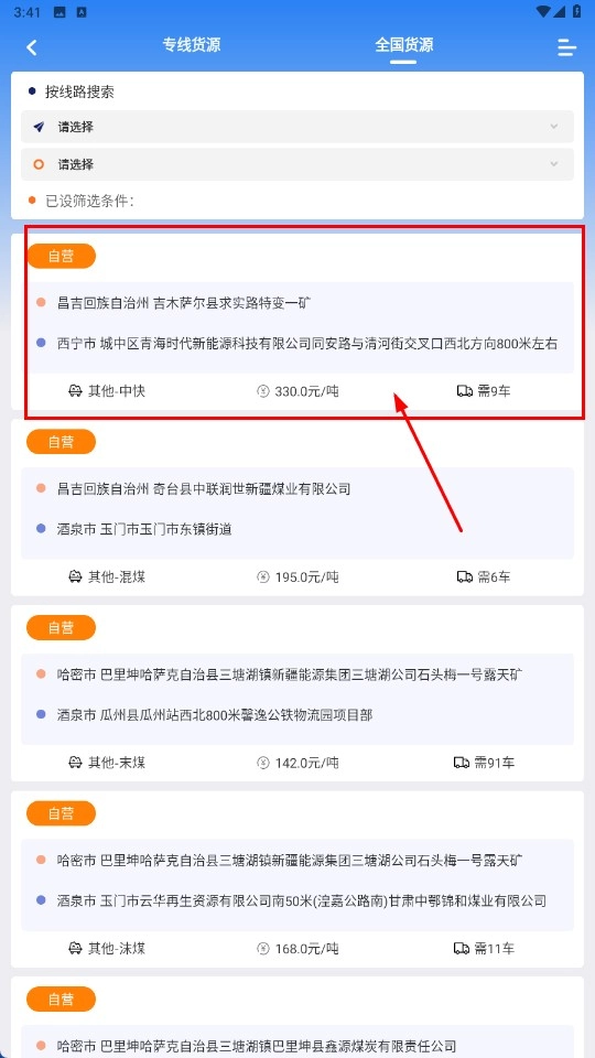 筛选结束后,在全国货源列表里点击你感兴趣的货源条目,就能查看该货源的详细信息。