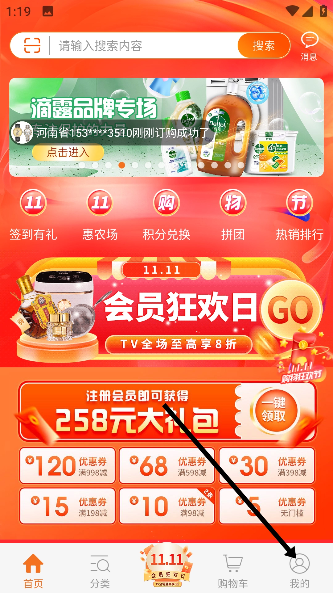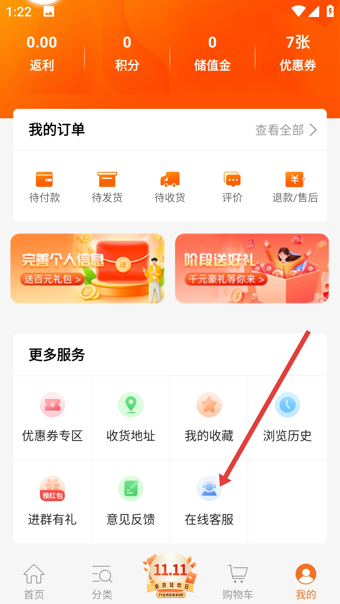 在购物应用的主界面,点击底部的【我的】按钮,即可进入个人中心页面。