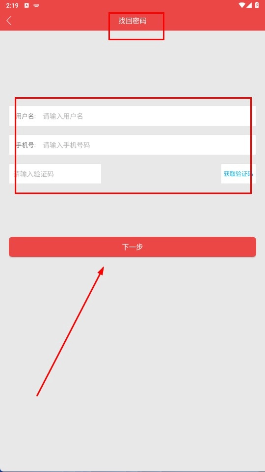 在密码找回页面,输入用户名和手机号,获取验证码后点击【下一步】按钮,即可完成密码找回的操作流程。