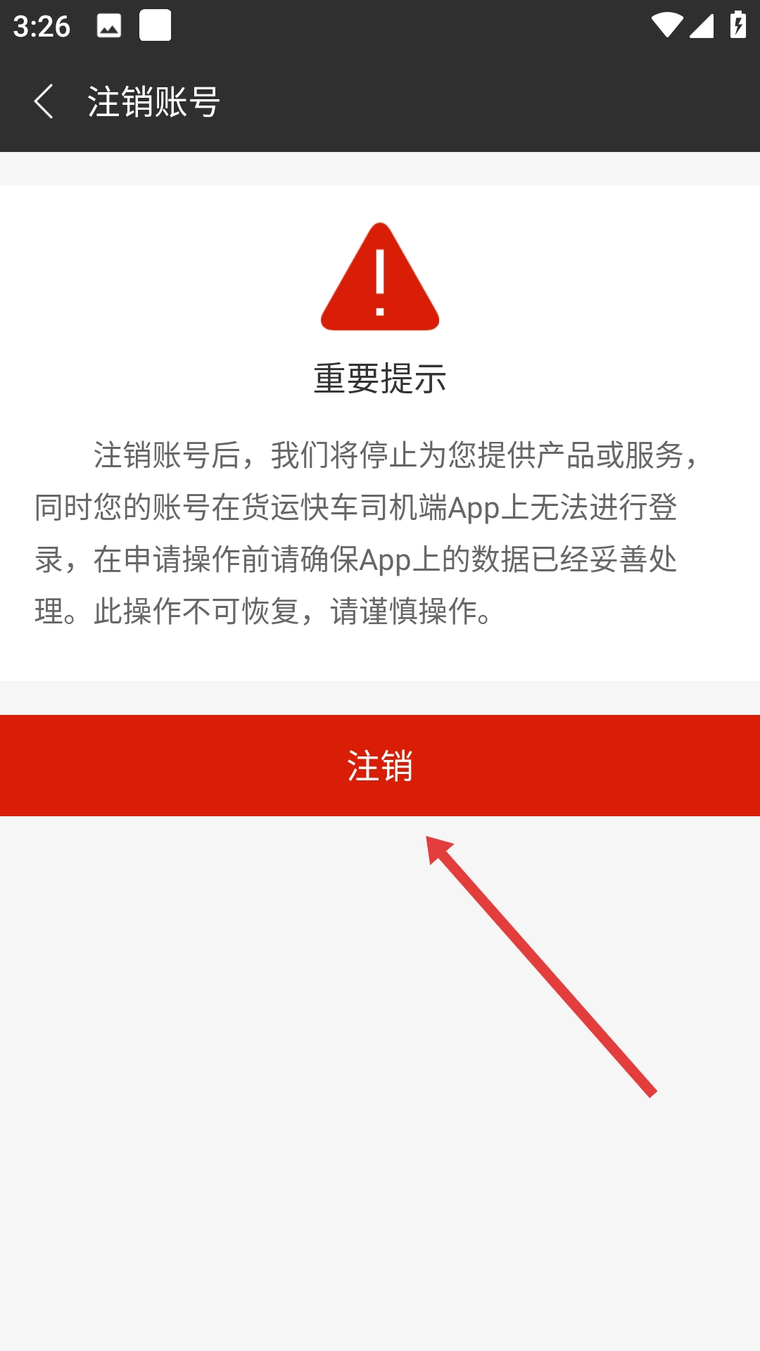 在账号注销页面,认真阅读重要提示后,点击【注销】按钮就能完成账号注销流程。
