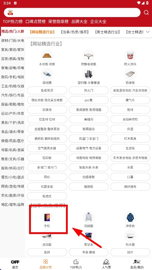 在品牌分类页面,点击【手机】分类图标,即可进入手机品牌页面。