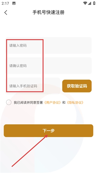 输入密码、再次确认密码,同时获取输入手机验证码,随后点击【下一步】按钮。
