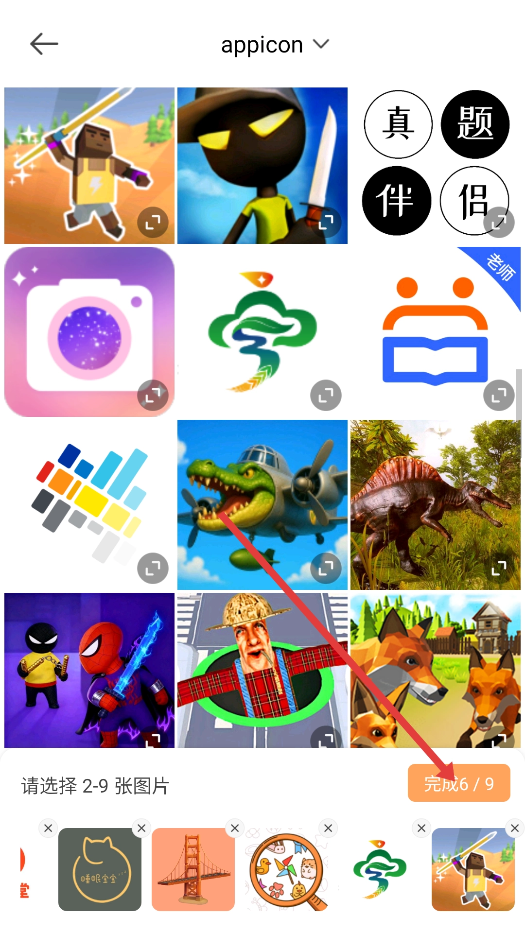 在图片选择界面,挑选2至9张图片后点击【完成】按钮,即可进入拼图编辑界面。