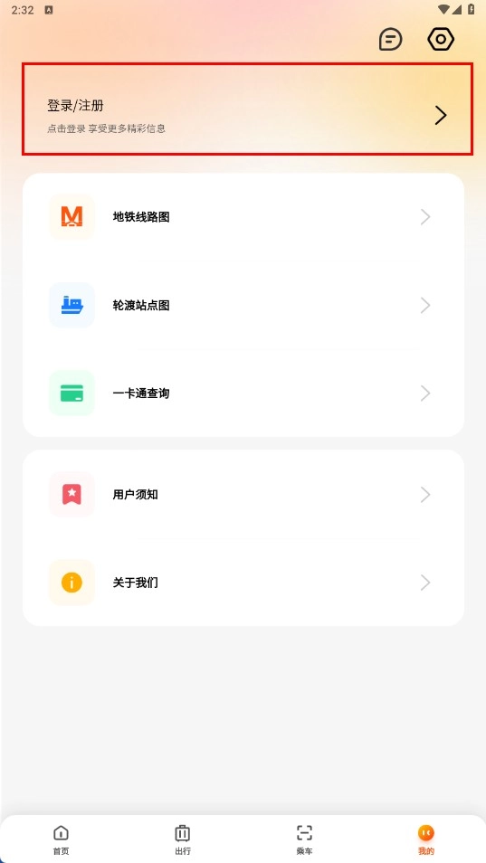 在个人中心页面,点击【登录/注册】功能入口,即可进入登录注册流程。