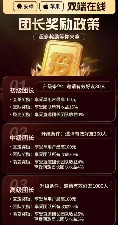 直邀奖励:享受单用户最高100元团队奖励:享受团队所有收益15%裂变奖励:享受直邀团长团队收益3%