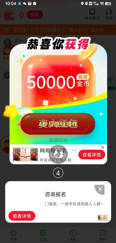 领取奖励的方式很简单,点击底部“热播”区域就能进入广告页面,完成后即可获得奖励。